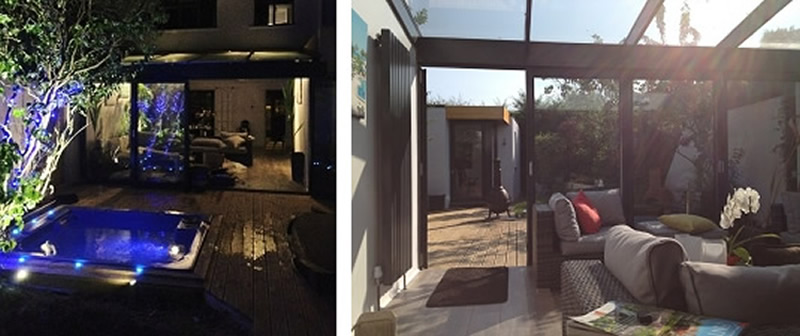 The rear extension has powder coated folding doors, a glass roof to the sun room and open plan kitchen opening out on to a raised deck featuring a sunken jacuzzi hot tub.